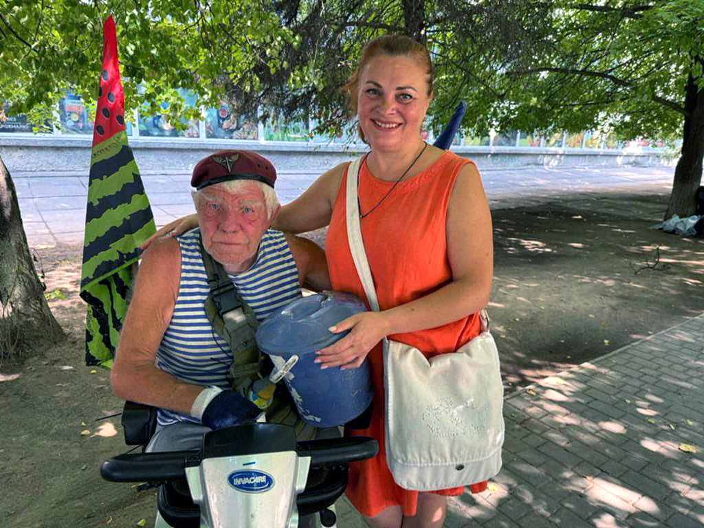 Світлана Думинська отримує від Григорія Янченка артефакт для майбутнього музею – те саме пластикове відро, в яке він збирав в окупації донати для ЗСУ. Фото з особистого архіву Світлани Думинської