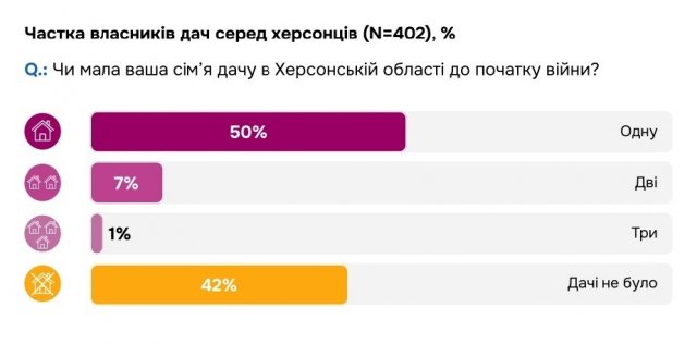 При цьому, значна частина херсонців мала дачі на лівому березі або в районах, що дуже близько прилягають до теперішньої лінії фронту. Через це руйнувань зазнали дачі 189 опитаних (68,7%), а до 231 дачі (84%) мешканці Херсонщини взагалі не можуть дістатися.