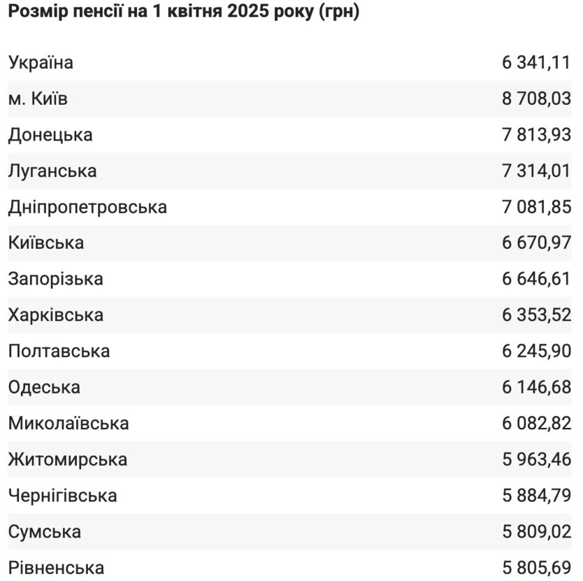 В Україні зберігається значна регіональна диспропорція у розмірах пенсійних виплат: жителі столиці та промислових регіонів отримують суттєво вищі пенсії порівняно з західними областями країни.Ця тенденція відображає історичні особливості економічного розвитку різних частин України та рівень заробітних плат, з яких здійснювалися відрахування до пенсійного фонду.За даними Пенсійного фонду України станом на 1 квітня 2025 року, найвищі пенсії зафіксовано в Києві, де середній розмір виплат становить 8 708 гривень.