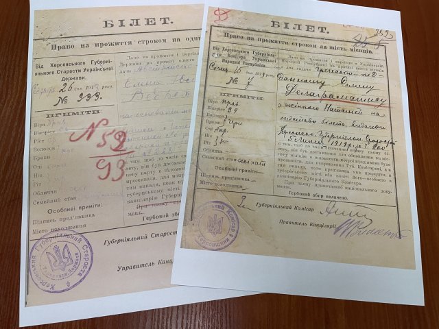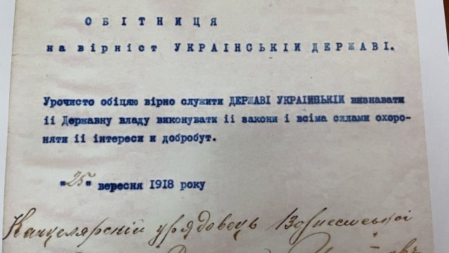У посвідченнях на проживання на печатці був герб-тризуб у різних варіаціях. Найбільший масив тогочасних актів – обітниці на вірність Україні."Тут величезна кількість цих обітниць. Вона дуже коротенька, урочисто обіцяє вірно служити державі українській, визнавати її владу, виконувати закони й всіма силами охороняти інтереси добробуту. Це 1918 рік. І зараз, от коли ми маємо лише електронні копії про цей період, то можна 100% стверджувати, що вони (російські окупанти — ред.) не просто хочуть знищити як державу, вони знищують нашу історію", — говорить директорка архіву.