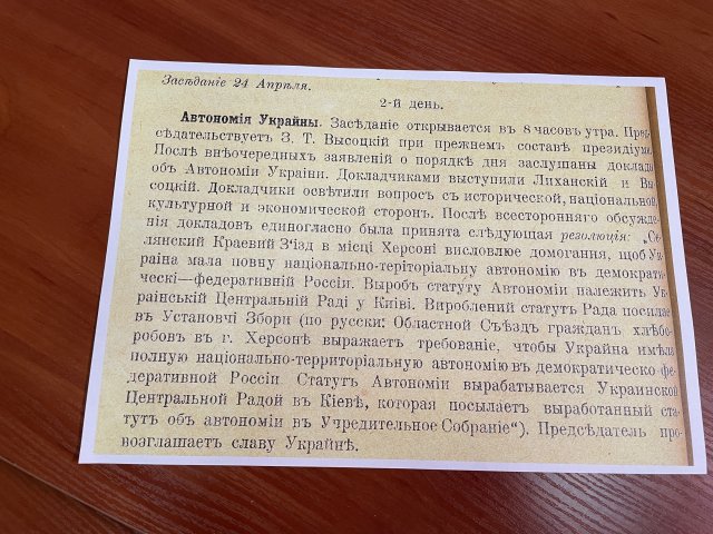 Усі оригінали збережених документів вивезли російські військові наприкінці жовтня – початку листопада 2022 року, коли відступали з Херсона. Документи збереглись у цифровому форматі. Один із них – заклик представників земств і політичних партій визнати Херсонську губернію українською територією і приєднати до УНР. З’їзд відбувся у квітні 1917 року."Одразу ж у 1917 році жителі Херсонської губернії на той час дуже активно підтримували ідею автономності України. І хотіли увійти в склад УНР. І увійшли, як окрема губернія. У місті активно почали працювати товариства "Українська хата", "Просвіта", працювала друкарня. Найцікавіше, що деякі універсали друкувалися у Херсоні, діяв театр імені Шевченка, Український національний", — розповідає директорка державного архіву в Херсонській області Ірина Лопушинська.