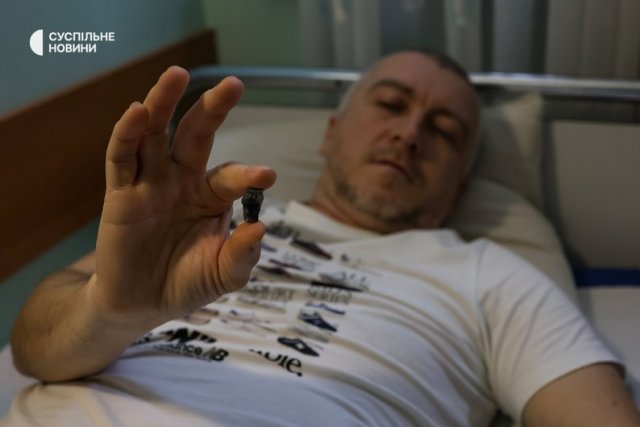 "Один застряг, ось його дістали. Один пройшов навиліт і ще дрібними посікло ноги", — староста Антонівки Сергій Іващенко показує металевий уламок, лежачи на лікарняному ліжку. Наприкінці січня, обстежуючи свій округ після нічного обстрілу, він потрапив під атаку російського дрона. Каже, це вже його третій "день народження"."Був туман, потім він розсіявся і вони масово полетіли по наших школах. Я почув, що летить близько і знижується. Встиг упасти на землю. Це мене врятувало", — згадує Сергій.