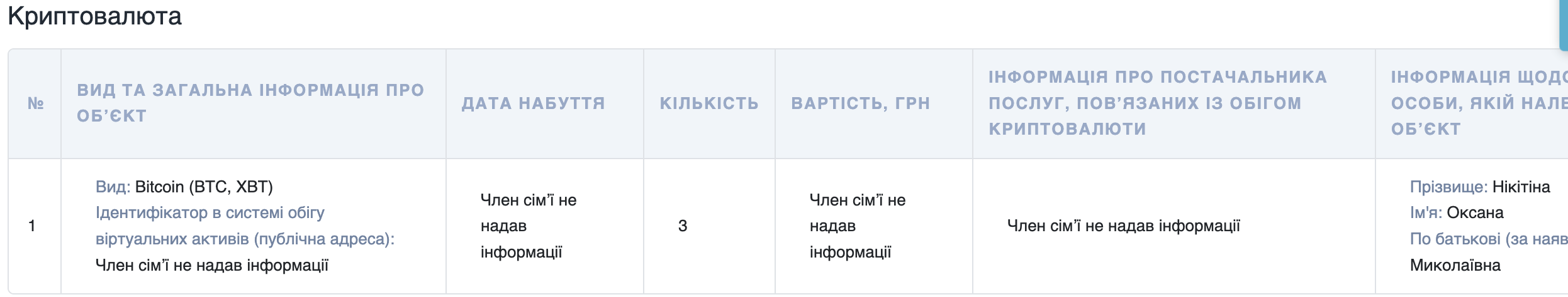 Скрін з декларації за 2024 рікМожна припустити, що Оксана Нікітіна придбала квартиру за біткоїни, які їй належали торік, адже у цьогорічній декларації інформації про них немає.