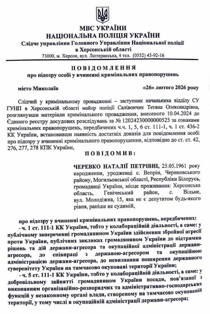 Перша сторінка повідомлення про підозру Наталії Черевко. Фото: kherson.gp.gov.ua