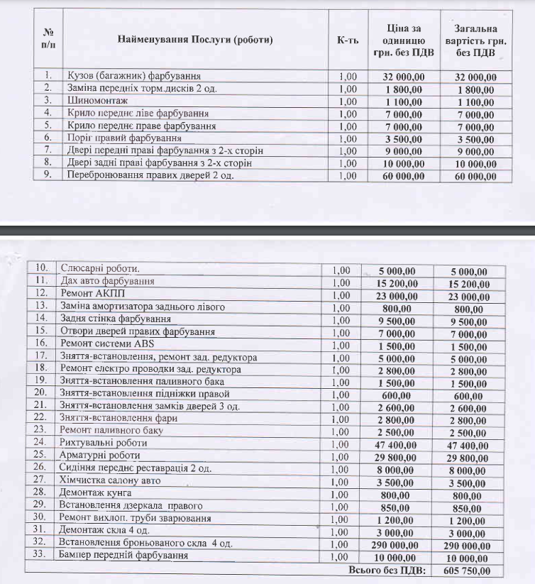 До зазначеної суми входять 26 найменувань комплектуючих та 33 найменування видів послуг. Якщо проаналізувати специфікацію та всі найменування комплектуючих і послуг, можна дійти висновку, що броньоване авто дуже сильно пошкоджене і ремонт відбувається майже «з нуля»: заміни та ремонту потребують чи не всі складові авто.