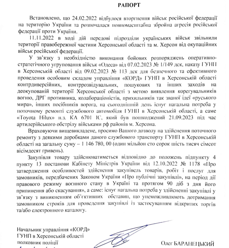 Херсонське управління Національної поліції України оприлюднило угоду на ремонт броньованого авто Toyota HILUX за 1,1 мільйона гривень. Про це повідомляє «Антикорупційний вимір» із посиланням на закупівлю.Закупівля відбувається коштом Державного бюджету та без тендерної процедури — прямим укладанням угоди. Це дозволяє Закон.Виконати замовлення має ТОВ «База 100», зареєстроване у серпні 2021 року.