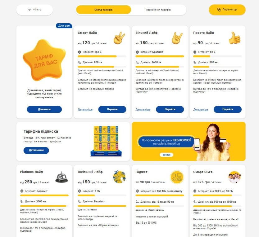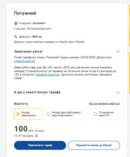 Lifecell виділяється тарифом "Потужний" з безлімітним інтернетом, де перші 60 ГБ надаються на максимальній швидкості. Вартість пакету становить від 100 до 165 гривень на місяць. Додатково оператор пропонує новим абонентам зафіксувати ціну до кінця 2025 року за програмою "сТОП-ціна".