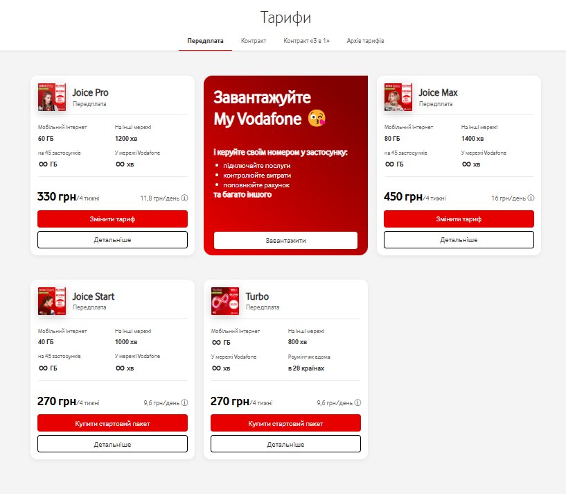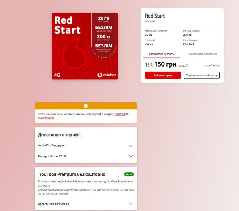 Vodafone пропонує тариф Red Start від 120 гривень на місяць при переході з іншої мережі. Пакет включає 20 ГБ інтернету, 200 хвилин на всі номери та безлімітні дзвінки в межах мережі. Для активних користувачів доступний пакет Turbo з необмеженим інтернетом за 180 гривень на 4 тижні.