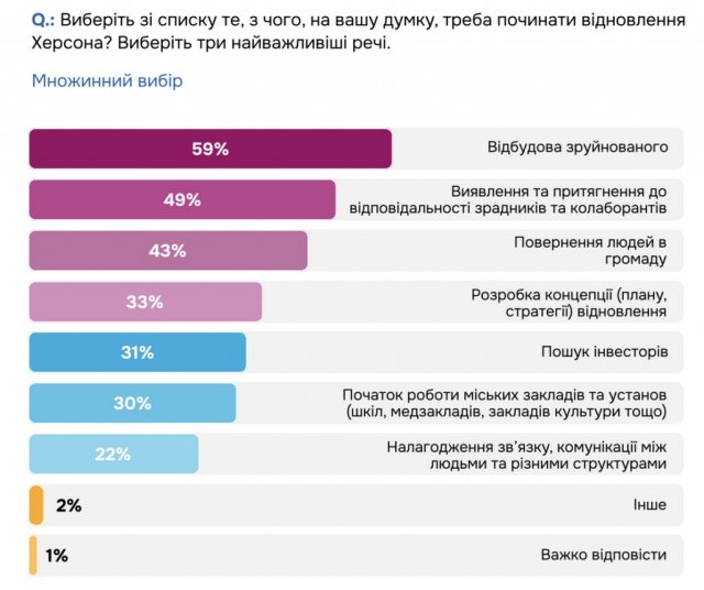 У контексті відновлення так само, як і в грудні 2023 року, до трійки пріоритетів увійшли: відбудова зруйнованих будівель (59%, +4%), виявлення та притягнення до відповідальності зрадників та колаборантів (49%, – 3%) і повернення людей в громаду (43%, + 2%).