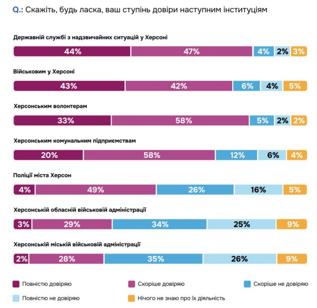 В дослідженні також йдеться і про інформаційні потреби містян. Так, для херсонців залишається важливою інформація про надання гуманітарної допомоги (36%), а ось тих, хто хотів би отримувати більше інформації про діяльність місцевої влади стало менше – у грудні 2023 року таких було 41%, а зараз 34%.