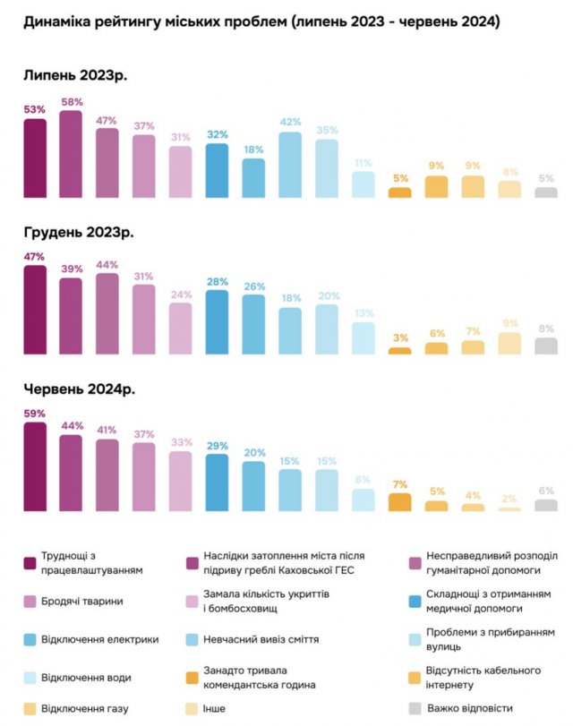 Згідно з результатами дослідження, рейтинг проблем Херсонської громади за останні півроку дещо змінився. Так, опитування вказало на збільшення труднощів із працевлаштуванням (59%, + 12% порівняно з груднем 2023), на 6% збільшилася занепокоєність проблемою бродячих тварин (37%, +12%) і замалою кількістю укриттів (33%, +9%). Також до п’ятірки найбільш актуальних проблем увійшли «наслідки затоплення міста після підриву греблі Каховської ГЕС» та «несправедливий розподіл гуманітарної допомоги».