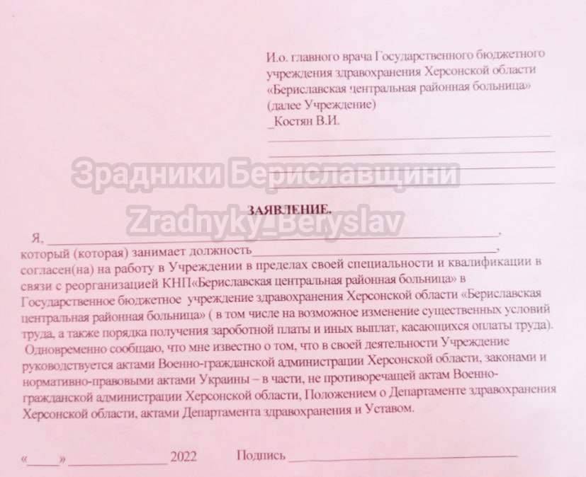 Одна зі свідків розповіла, що Костяна як виконувача обов’язків керівника лікарні перед трудовим колективом представили ще у травні 2022 року. Тоді ж співробітникам медзакладу роздали зразки заяви про перехід на роботу до створеної окупаційною владою лікарні. Зразок такої заяви публікує телеграм-канал «Зрадники Бериславщини»: