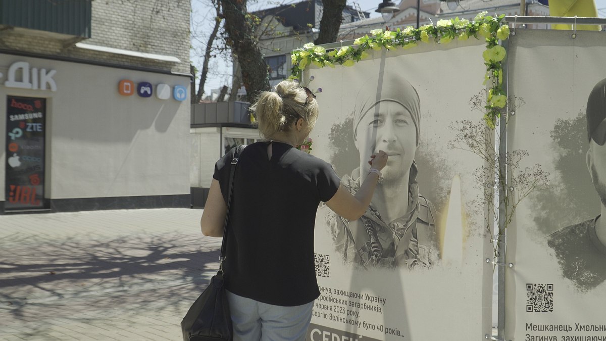 «Як ти тут, сонечко?» – Вікторія Зелінська принесла квіти до портрета свого загиблого чоловіка. Банер зі світлиною херсонця Сергія Зелінського встановили на Алеї Героїв у Хмельницькому. Туди під час окупації виїхала дружина воїна з двома дітьми. Сергій служив теж у Хмельницькому – в підрозділі Сил спеціальних операцій.