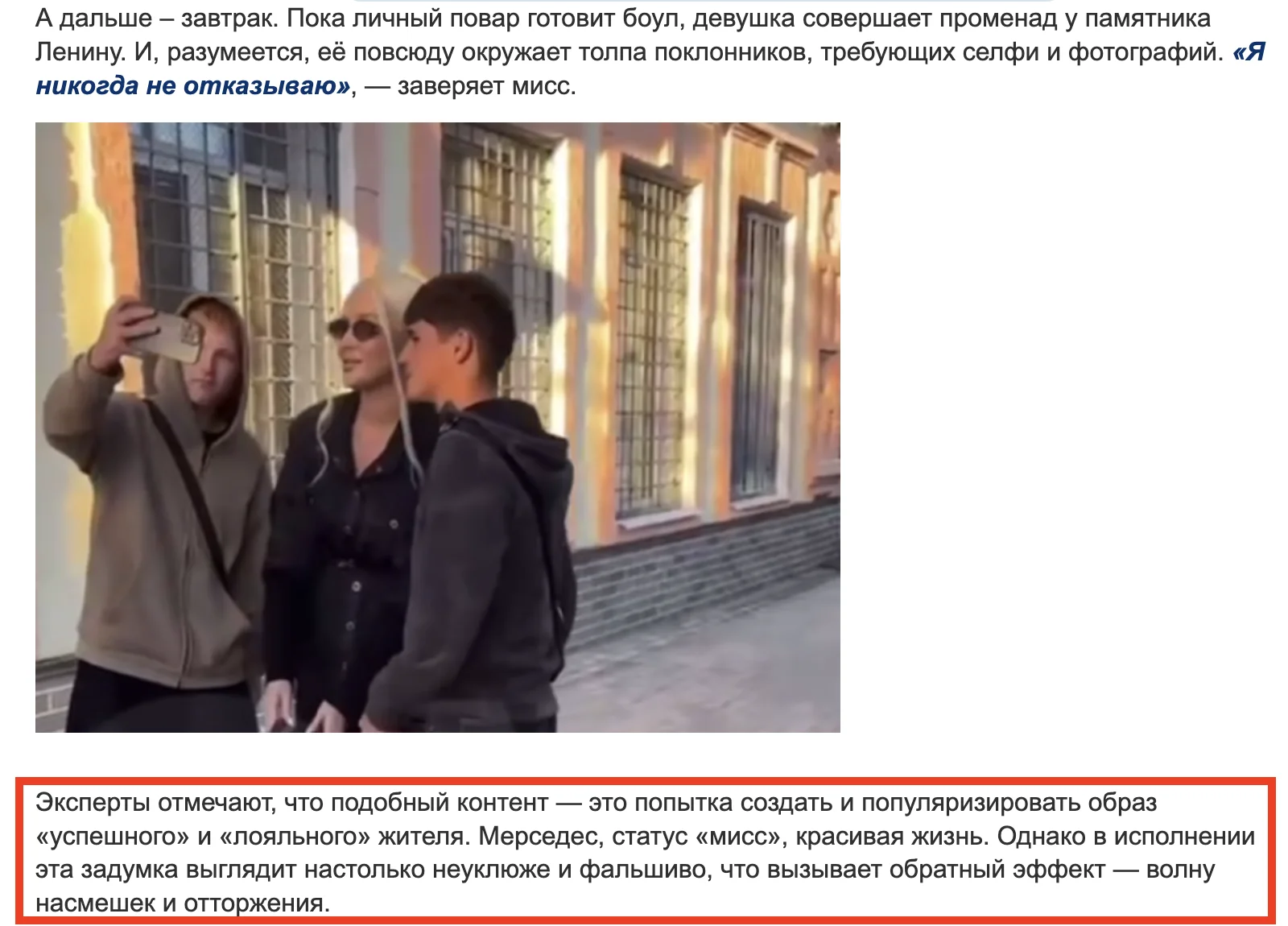 Фото: Instagram Катерини ПоповчукАле попри старання Катерини Поповчук, її стиль життя та контент не оцінили навіть місцеві пропагандисти, розкритикувавши те саме відео ранкової рутини самопроголошеної Міс.