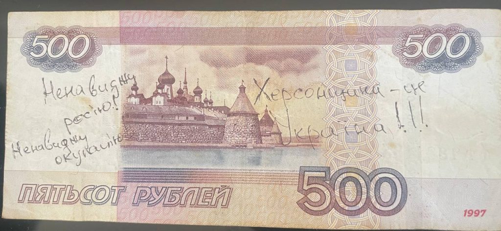 У тимчасово окупованому місті Скадовськ на лівобережжі Херсонщини активісти залишили окупантам повідомлення на російських рублях.Про це йдеться в дописі руху “Жовта Стрічна” на сторінці в Telegram.На російських банкнотах номіналом в 100 та 500 рублів, активісти написали “Геть окупантів” та “Скадовськ — це Україна”, “Ненавиджу росію. Ненавиджу окупантів”, “Ми продовжуємо боротися за Україну”,“Це ще один приклад, що українці продовжують спротив російському режиму та чекають на деокупацію”, – йдеться в дописі руху.