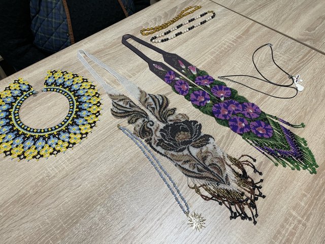 За словами Олени, рукоділлям вона захоплюється з дитинства: шиє, в'яже, вишиває. А з 2017 року почала виготовляти вироби з бісеру на продаж. Частину вилучених коштів спрямовує на допомогу ЗСУ."Ґердани, так само як і силянки, — це наш український спадок. А ось такі прикраси з цитрину, з агату та перлин — це вже більш сучасні прикраси", — пояснила Олена.