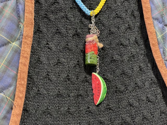 На шиї майстриня носить прикрасу, виготовлену за власним ескізом. Каже, це її особистий оберіг."В мене подружка — теж майстриня, котра робить з полімерної глини ось такі прикраси. Вона зробила мені кавунчик херсонський і закрутку харківську — це я так її називаю. Ну, і наш тризуб, і жовто-блакитний шнурок. То я так вирішила, що це мій оберіг, тому завжди його ношу", — сказала волонтерка.