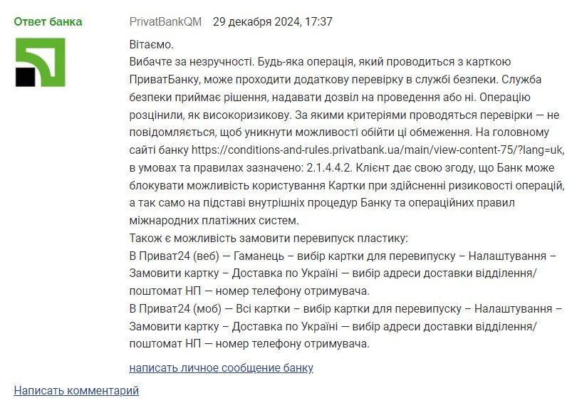 Як повідомив ПриватБанк у своєму офіційному відповіді, будь-яка операція з карткою може проходити додаткову перевірку службою безпеки банку. При цьому критерії таких перевірок банк не розголошує "з метою уникнення можливості обійти ці обмеження".