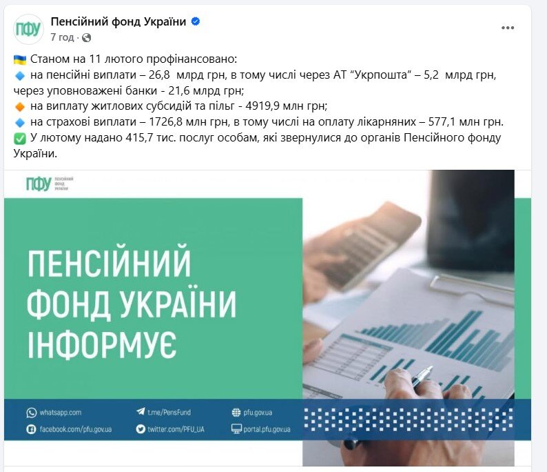 Українцям показали, як проходить виплата пенсій, субсидій на комунальні послуги та лікарняних за лютий.Як передає "Хвиля", про це повідомила пресслужба ПФУ.Пенсійний фонд продовжує спрямовувати кошти на виплати українцям. Зокрема, станом на 11 лютого профінансовано:на пенсійні виплати – 26,8 мільярда гривень, зокрема через АТ "Укрпошта" – 5,2 мільярда гривень, через уповноважені банки – 21,6 мільярда гривень;на виплату житлових субсидій та пільг – 4919,9 мільйона гривень;на страхові виплати – 1726,8 мільйона гривень, зокрема на оплату лікарняних – 577,1 мільйона гривень.