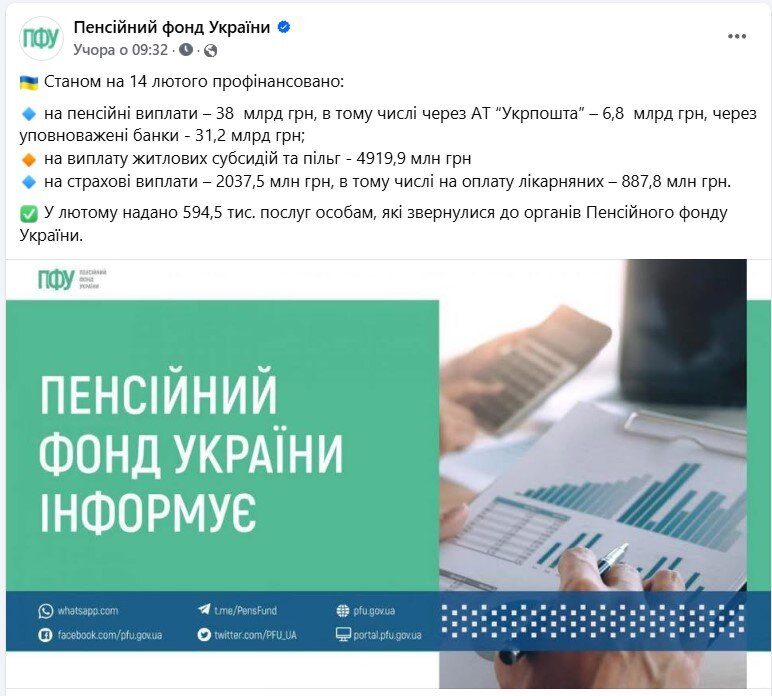 Із них більша частина – 31,2 мільярда гривень – була перерахована через банківські установи, а 6,8 мільярда гривень доставлено отримувачам через АТ "Укрпошта".