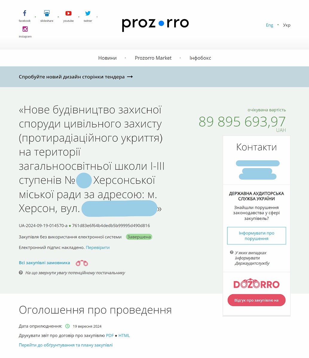 Закупівлю провели 19 вересня без відкритих торгів (закон дає на це право, бо замовник перебуває на території активних бойових дій), оприлюднена лише договірна ціна без підсумкових відомостей ресурсів. Порівняти ціни будматеріалів та обладнання з ринковими на предмет можливого завищення, визначити, чи передбачено у цій закупівлі шкільне оснащення та обладнання для повноцінного навчання, чи споруджуватимуться лише «стіни» для укриття, неможливо, бо кошторис цієї закупівлі на Prozorro не опублікований. Верховна Рада вже прийняла закон, згідно з яким публікація кошторисів під час закупівель послуг з будівництва на Prozorro є обов'язковою, але він ще не набрав чинності. До речі, приховані кошториси проєктів ще двох підземних шкіл / укриттів у Херсоні. Це загалом три будівельних проєкти на суму 294 мільйони.