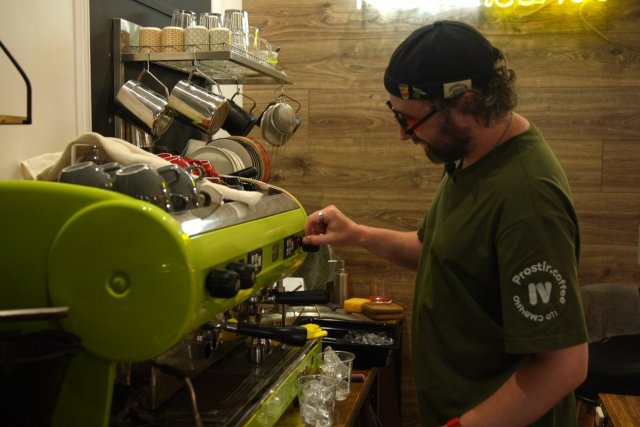 У кілометрі від продуктової крамнички на тихій (між обстрілами) тінистій вулиці працює крафтова кав’ярня з повним "хіпстерським" набором напоїв. Данина війні — режим роботи закладу: з 9:00 до 15:00. Але, зауважує бариста Олексій Мельниченко, для постійних клієнтів може і затриматися."Якщо мене попередили, я можу до сьомої залишатись. Але буває так, що після першої нікого і немає", – каже Олексій.