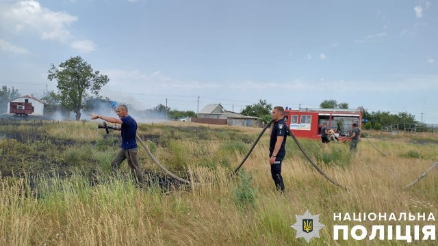 Вчора опівдні поліцейські офіцери Чорнобаївської громади Віталій Шаповал та Ярослав Масло у Посад-Покровському помітили густий дім. Вони відразу кинулися на місці пожежі та побачили, що горить суху траву на присадибній ділянці біля зруйнованого будинку. Про це повідомила пресслужба поліції Херсонської області.Через спекотну погоду й сильний вітер вогонь швидко поширювався та міг перекинутися на сусідні подвір’я, житлові будинки та господарські споруди.