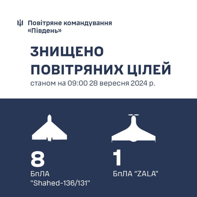 У ніч на 28 вересня 2024 року протиповітряною обороною півдня України збито 8 ударних безпілотників «Shahed-136/131».Про це у Фейсбук повідомляє Відділення комунікацій повітряного командування «Південь».Російські окупаційні війська атакували Одещину двома балістичними ракетами, ймовірно «Іскандер-М», із території тимчасово окупованого Криму.Зранку на Херсонському напрямку ворог завдав авіаудару із застосуванням КАБів.