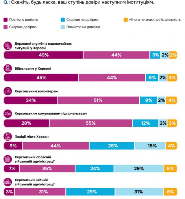 Відповідаючи на питання про відновлення міста, херсонці вказують, що в першу чергу треба буде відновлювати зруйновані будинки (67%), роботу медичних закладів (55%) та роботу промислових підприємств (49%). А от будівництво зараз підземних шкіл вважають доцільним лише 10%.54% людей, які взяли участь у дослідженні, заявляють, що залишаються в місті, бо "Херсон — це моє місто, і я його не покину за жодних обставин". 51% не виїжджає, бо не можуть дозволити собі винаймати квартиру в іншому місті, 45% — не можуть залишити рідних".На запитання, що тримає їх у цей час, 57% херсонців відповіли — спілкування з рідними та друзями.