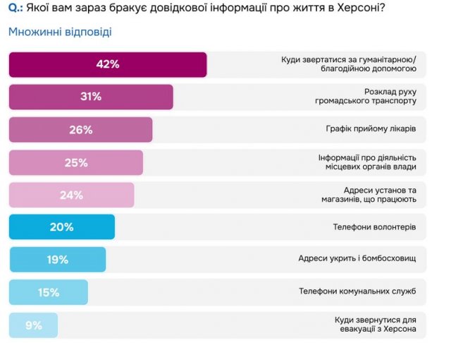 Дослідження показало, що 42% херсонців мають складнощі з пересуванням містом громадським транспортом, 36% – з ремонтом побутової техніки й 28% – з ремонтом будівель. Порівняно з лютим 2024 року майже вдвічі зменшилася частка тих, хто мав проблеми з доступом до інтернету (було 43% – в листопаді стало 24%).Також жителі Херсона виділили три теми, з інформацією про які вони мають складнощі. Це куди звернутись за гуманітарною допомогою, діяльність місцевих органів влади та графік прийому лікарів.