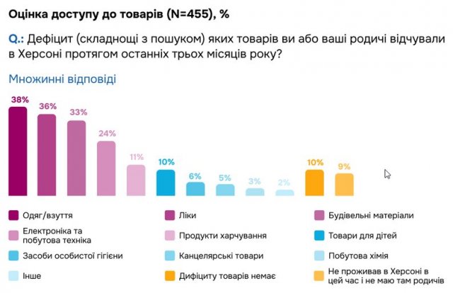Також за результатами дослідження, херсонці позитивно оцінюють якість надання більшості комунальних послуг. Це стосується постачання газу, електрики й води, вивозу сміття та прибирання вулиць. Проте роботу ліфтового господарства оцінюють стримано."З липня 2024 пошук одягу та взуття, ліків та будівельних матеріалів залишається найбільш проблемним для третини херсонців. У листопаді ці показники дещо виросли. В коментарях частина респондентів вказувала, що це пов’язане з ускладненнями пересування містом через погіршення безпекової ситуації", — йдеться у статті.