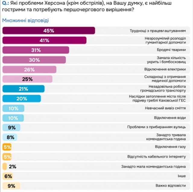 За останні півтора року до трійки найбільших проблем Херсона стабільно входять труднощі з працевлаштуванням, незрозумілий розподіл гуманітарної допомоги та бродячі тварини. Дослідження проводив Фонд громади міста Херсон "Захист".Його результати опублікували на сайті фонду."Проте у листопадовому опитуванні гострота всіх трьох цих проблем дещо знизилася: на 9%, 4% і 12% відповідно", — йдеться в статті про дослідження.