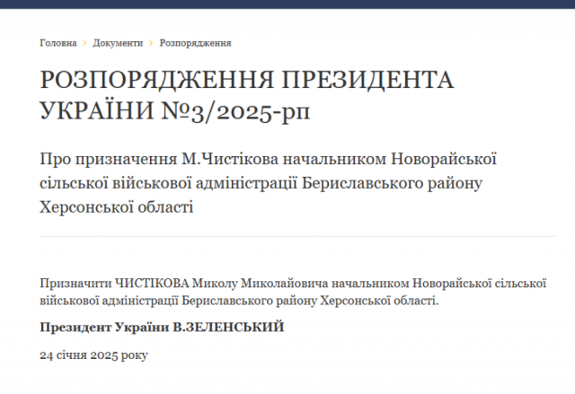 Президент України Володимир Зеленський підписав розпорядження №3/2025-рп і призначив Миколу Чистікова на посаду начальника Новорайської сільської військової адміністрації.Про це повідомив начальник Херсонської обласної військової адміністрації Олександр Прокудін.«Вітаю Миколу Миколайовича з новим етапом у його професійному житті! Вірю, що цей крок принесе користь Новорайській громаді, і разом ми зможемо зробити багато важливих справ для її жителів», – написав Прокудін.