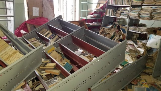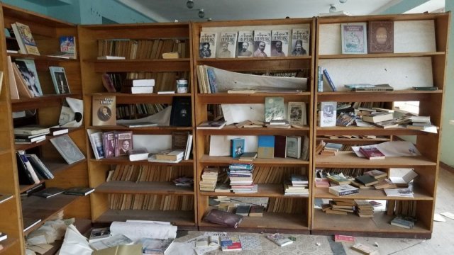 "Обліку ще не було. Це просто зараз дуже важко зробити. У нас тут фонд більше 20 тисяч книжок. Але я побачила, наприклад, що "Донецький аеропорт" книги немає. Ще у мене така брошура була про Бандеру. Я її теж спочатку не могла знайти. Ось її стан, ви можете побачити: брудна, замизгана. Я її вже знайшла в одному із кабінетів на другому поверсі, коли ми прибирали", — розповіла завідувачка.