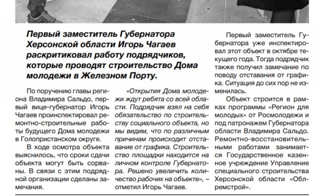 Відкриття будинку молоді ніби «ждут ребята», як пишуть пропагандистські медіа, але підрядник не може виконати роботи: «Підрядник узяв на себе зобов’язання виконати будівництво соціально важливого об’єкта, але ми бачимо, що за різними причинами роботи виконуються із затримкою. Будівництво цього об’єкта знаходиться на особистому контролі губернатора. Прийнято рішення збільшити кількість робітників на об’єкті», — заявив окупаційний «перший віце-губернатор» Ігор Чагаєв.