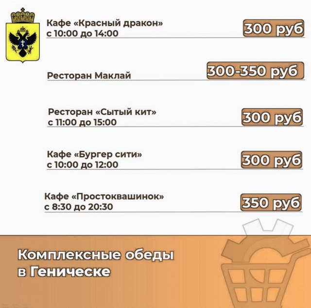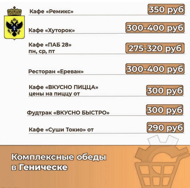 Тепер - скільки коштує повноцінний обід. Окупаційний мінпромторг прозвітував, що комплексні обіди у кафе і ресторанах Генічеська у середньому коштують 275 - 400 рублів. Але що входить до складу таких обідів, у «міністерстві» не уточнили. За вартістю це мають бути ті самі біляш з кавою. А скільки ж коштує приготувати обід самому? Спочатку «заглянемо» на овочевий ряд Генічеського ринку. Картопля нині трішки подешевшала, бо на лівобережжі саме викопали другий врожай. Була 70, стала 60 і навіть 50 руб/кг. Тож на пару з гречкою (60 - 70 руб/кг) вона залишається найпопулярнішим серед генічан (особливо, пенсіонерів) продуктом. Солодкий перець коштує 80-100 (великий червоний - всі 150) руб/кг, морква і буряк - 60, помідори-«сливки» - 40 - 50, невеликі рожеві - 100 - 120, огірки - 80 - 120, цибуля - ЗО - 40 (також подешевшала, бо йде збір врожаю), баклажани - 80, часник - 150 - 200, лимони -180, апельсини - 250, гранати і хурма - так само, мандарини - 300 руб/кг.