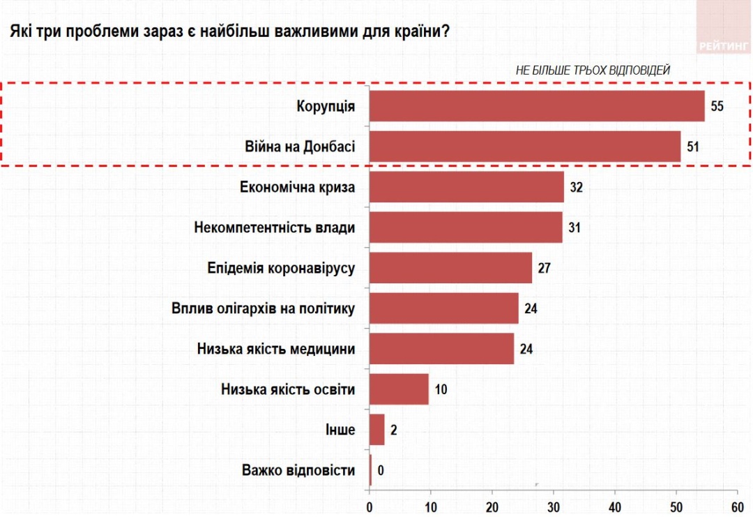 Самыми важными проблемами в стране назвали коррупцию (55%) и войну на востоке (51%), а также экономический кризис (32%), некомпетентность власти (31%), эпидемию коронавируса (27%), влияние олигархов на политику (24%) ) и некачественную медицину (24%).