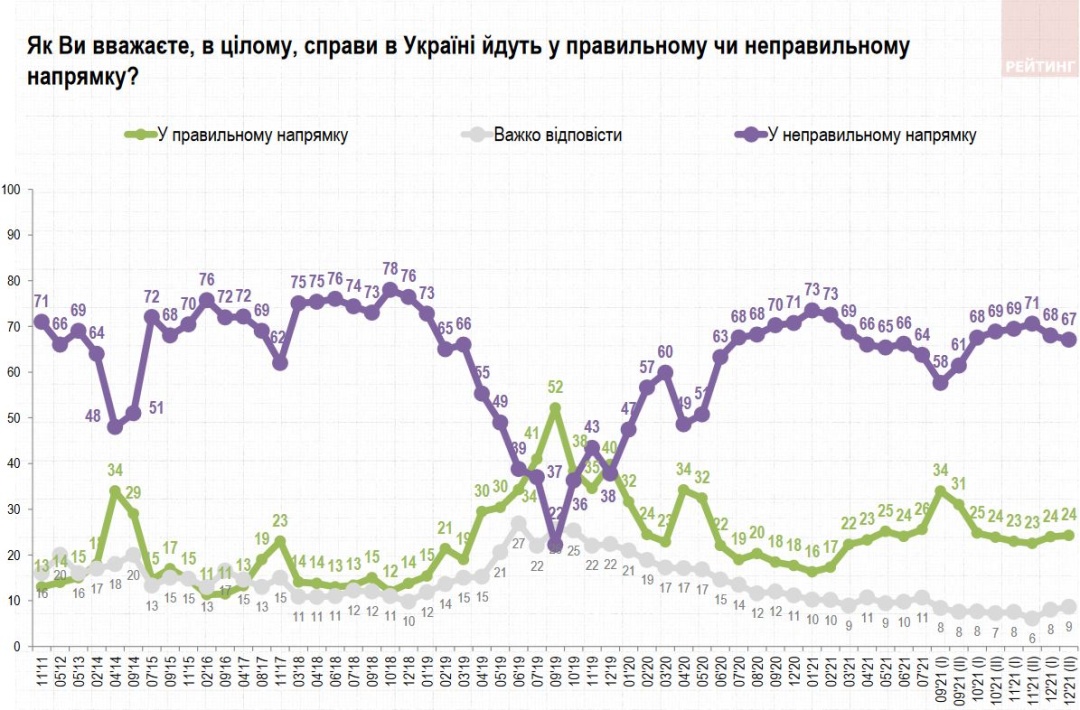 В целом, как показывает опрос, 67% украинцев считают, что страна движется в неправильном направлении, 24% – в правильном. 9% – не определились.