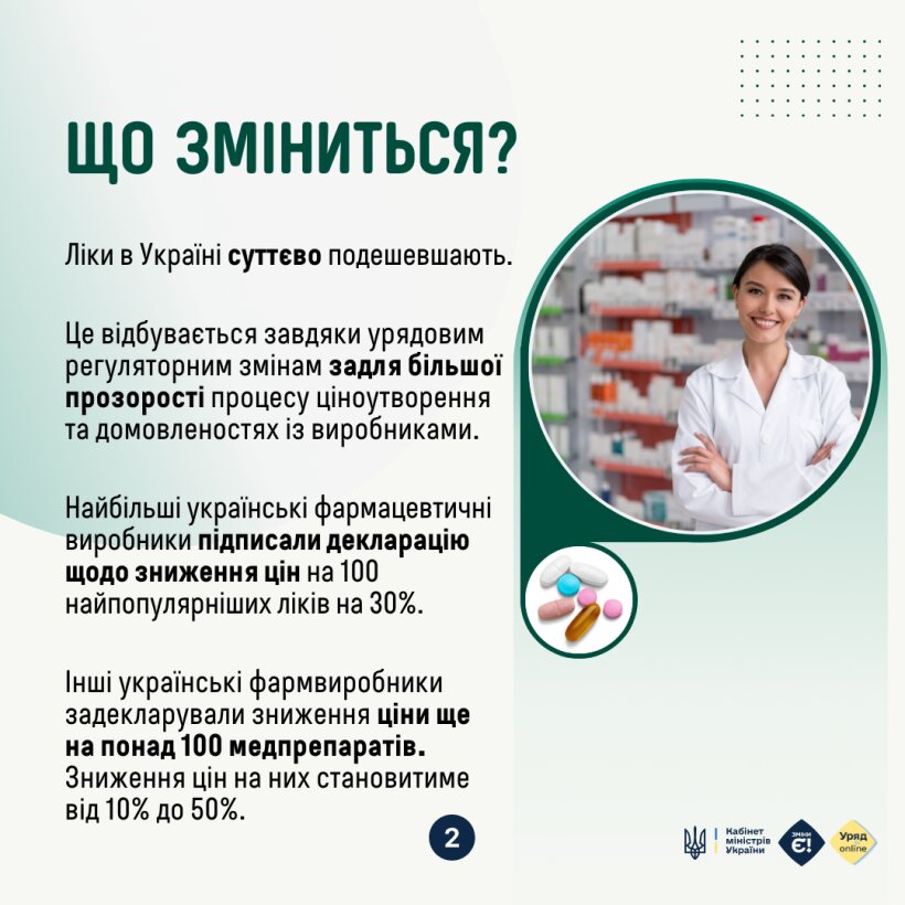 В Україні суттєво подешевшають ліки. Це відбувається завдяки урядовим регуляторним змінам та домовленостях з виробниками.Найбільші фармацевтичні компанії вже підписали декларацію про зниження цін на 100 найпопулярніших препаратів на 30%, а інші виробники знизять ціни ще на понад 100 медикаментів на 10-50%.Які саме ліки подешевшають та коли це відбудеться – дивіться в інфографіці Департаменту комунікацій Секретаріату Кабінету Міністрів України.