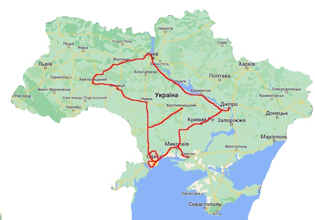 "Скільки додали спортсмени у Франції – стільки долав і я в Україні. Стартував із Одеси до Херсона, потім повернувся назад. Далі поїздив по Одеській області та по колу в міста: Кропивницький, Миколаїв, Кривий Ріг, Дніпро, Кременчук, Черкаси, Київ, Житомир, Хмельницький та інші. Фініш був знову таки в Одесі. Намагався їздити по більш-менш якісному дорожньому покриттю, тому й вигадав саме такий маршрут", – ділиться Сергій.