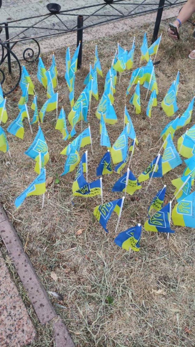 На прапорцях написали імена та прізвища хлопців, які загинули у Херсоні — біля обласного ліцею, у Бузковому парку, Каланчаку. На пам'ять про всіх херсонців, які загинули за Україну, каже депутатка.