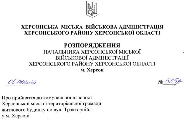 У Херсоні міська влада прийняла у комунальну власність житловий будинок на вулиці Тракторній.Про це свідчить розпорядження начальник військової адміністрації громади Романа Мрочка № 565р з сайту міськради.Відомчий житловий будинок у комунальну власність передав Херсонський завод карданних валів, яким в межах припинення зараз керує арбітражний керуючий Артур Мегеря.