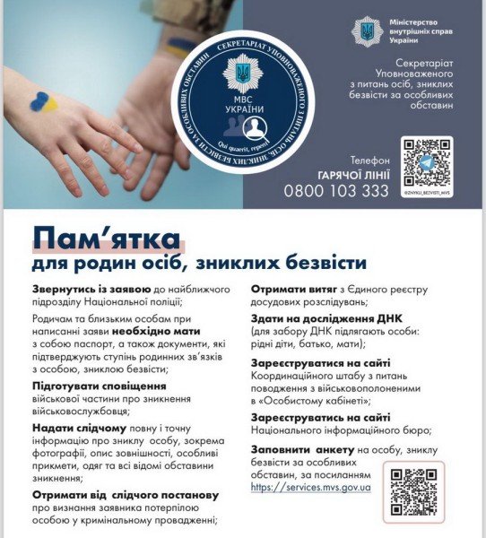 1. Отримати інформацію щодо алгоритму та порядку дій рідних із пошуку зниклих безвісти;