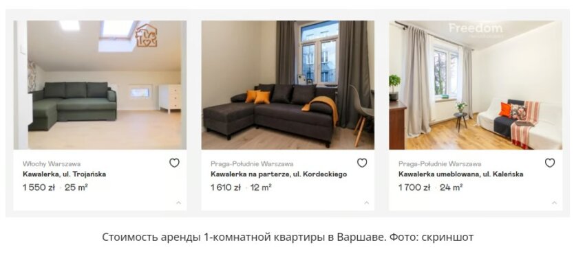 Орендна плата у столиці Польщі варіюється суттєво. За невелику студію доведеться заплатити щонайменше 1600 злотих (17000 гривень), а ціна однокімнатної квартири може досягати 16000 злотих (166000 гривень). В середньому оренда обходиться у 6000-7000 злотих щомісяця (60000-70000 гривень), що становить приблизно 60-70% від середнього заробітку жителів Варшави.