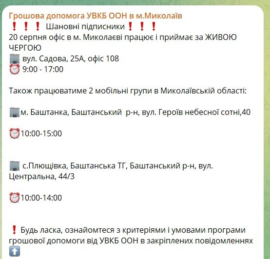 - м. Баштанка, вул. Героїв Небесної сотні, 40 – з 10:00 до 15:00;