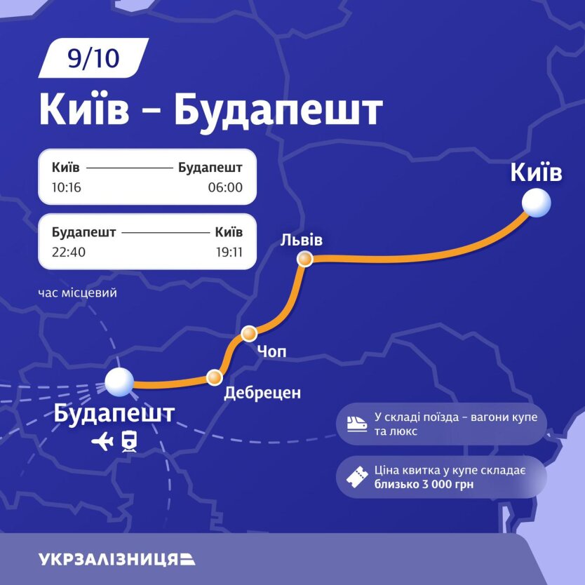 Крім того, з 15 грудня також почне курсувати потяг №9/10 з Києва до Будапешту – великий залізничний та авіаційний хаб.