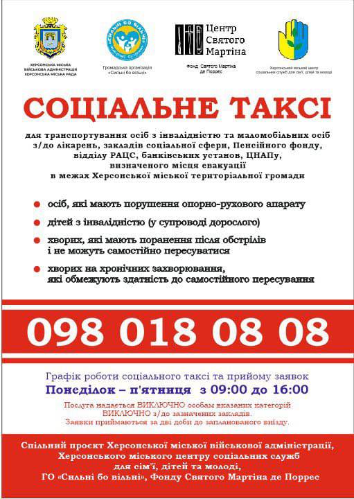 На базі Херсонського міського центру соціальних служб для сім'ї, дітей та молоді - завдяки об'єднанню зусиль з громадськими організаціями, які працюють з маломобільними групами населення - в Херсоні започатковано "Соціальне таксі".Про це у Фейсбук повідомив керівник Херсонської МВа Роман Мрочко.За номером +38 098 018 08 08 вже два тижні працює єдина телефонна лінія, яка розподіляє заявки між екіпажами Херсонського міського центру соціальних служб для сім'ї, дітей та молоді за підтримки Херсонської міської військової адміністрації (Херсонської міської ради) та ГО "Сильні, бо вільні" за підтримки Фонду Святого Мартіна де Порреса.