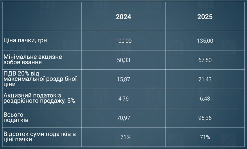 Голова парламентського комітету з фінансів Данило Гетманцев припустив, що середня ціна пачки сигарет у 2025 році складе 116,1 гривні, що на 18,6% більше за показник 2024 року. Для тютюнових виробів для електричного нагрівання (ТВЕН) очікується подібна динаміка: ціна пачки зросте до 120 гривень, що становить 12% збільшення.