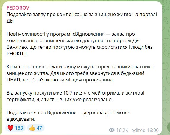 Федоров також поділився статистикою щодо ефективності програми. З моменту її запуску вже 10,7 тисяч сімей отримали житлові сертифікати, з яких 4,7 тисяч вже реалізовано. Ці цифри свідчать про високу затребуваність програми та її реальну допомогу постраждалим від військових дій.