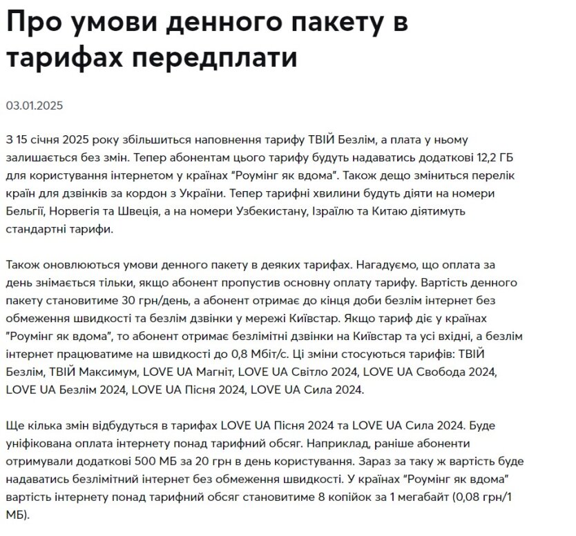 Тим часом компанія "Київстар" повідомила, що з 15 січня 2025 року оновлюються деякі умови користування денним пакетом. Ця плата застосовується лише у випадку, якщо абонент пропустив основну плату тарифного плану. Зміни відбудуться у таких тарифах як:- Твій Безлім;